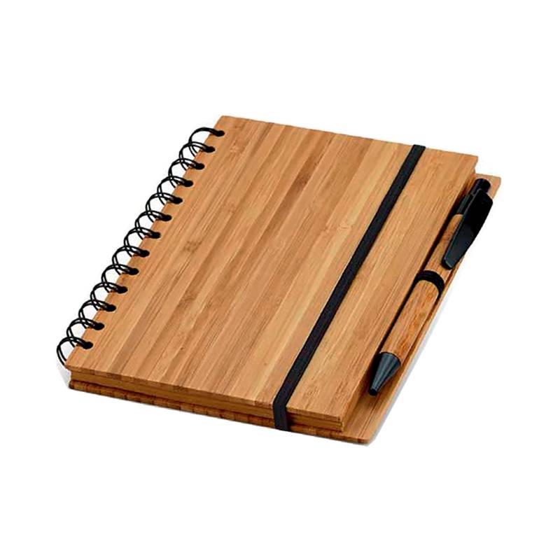 Spiralni blok A5 iz bambusa in kemični svinčnik iz bambusa s 70 črtastimi listi iz recikliranega materiala in zapiranjem na elastiko. Pisalo piše modro.