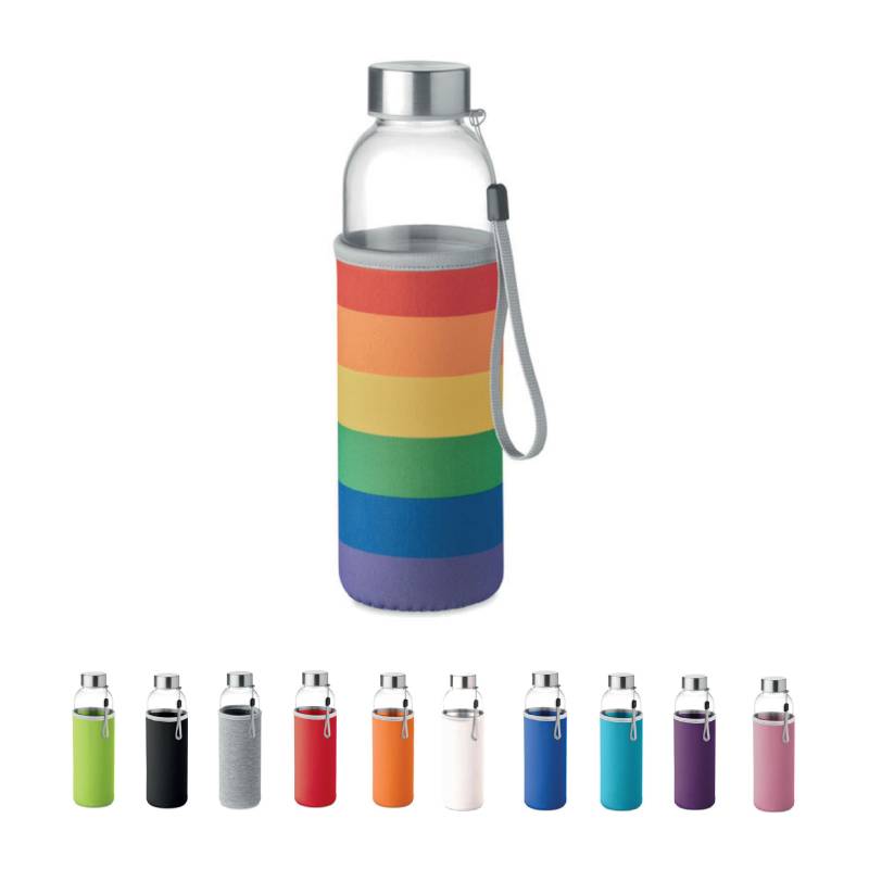 Steklenička z zanko 500ml za vodo v etuiju iz neoprena, ki ščiti stekleničko pred poškodbami. Zanka za prenašanje je prišita na etui iz neoprena. Pakirana v kartonasto škatlico. Ni primerna za gazirane pijače.