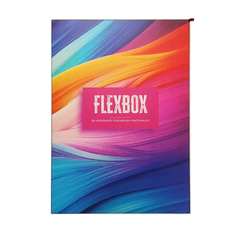 S sistemom FLEXBOX sestavimo okvir za poljubno dimenzijo grafike. Grafika je tiskana na poliesterski tekstil, na robovih ima našito gumo, ki jo potisnemo v okvir, tako da se grafika popolnoma prilega okvirju.