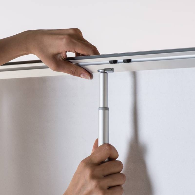 Palica je nastavljiva po višini vse do 230 cm. Grafika in palica se pospravita v okvir stojala.